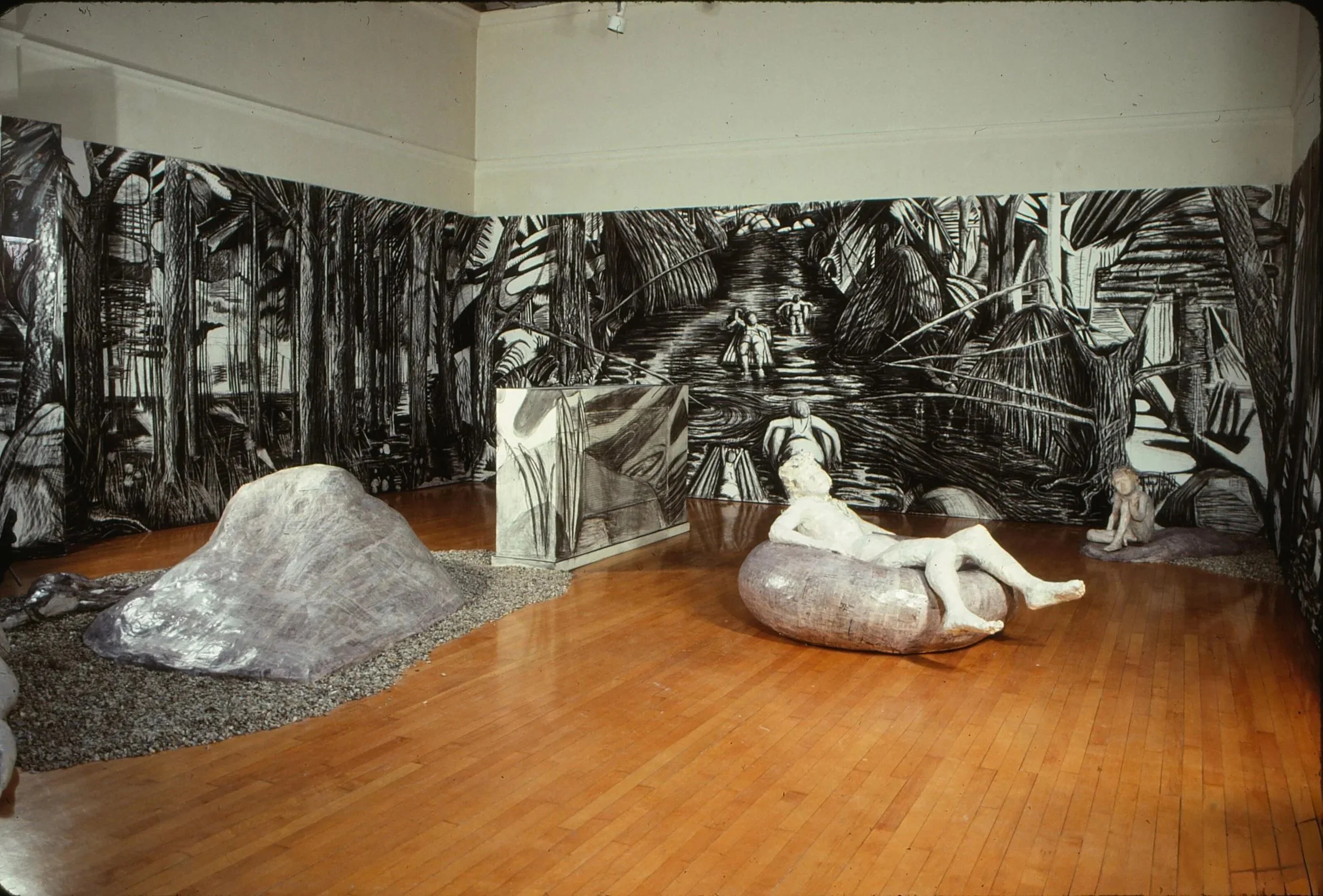 And the payoff? A site-specific installation exhibit in collaboration with my sculptor studio mate, Harriet Diamond, at the nearby art museum. Harriet made the paper maché sculptures of figures and rocks, and I created the drawn environment: all the walls and radiators and folding screens. First, I imagined the world, building a maquette in the shape of the specific gallery, and then finally created the images, one piece of expensive archival paper 50” X 38” after another covering all the surfaces bumper to bumper. I started the drawing about the river near my house with a deep perspective view of trees lined up towards the horizon, and a peek at water beyond. I used six sheets of paper to create the big charcoal drawing, 100” X 114”, and then, stepping back day after day, squinting my eyes almost shut, I realized that another two pieces of paper on the left side would help rebalance the drawing, skew it off its symmetrical predictability. I tacked the new white paper on the wall and then found myself adding two more. The piece shifted from a statement about perspective to a forest scene where the viewer entered a meandering walkway along a river path.
